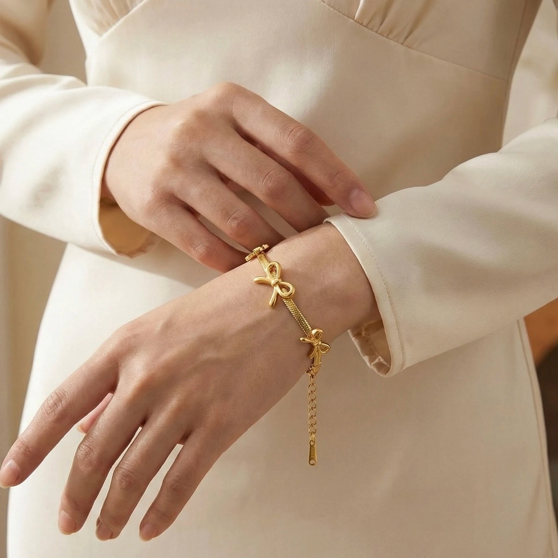 The Luxe Bow Charm BraceletĀ features a sleek snake chain adorned with three delicate bow charms, giving it a soft, feminine touch. Lightweight, adjustable, skin-friendly and anti-tarnish, it blends everyday elegance with a playful, chic vibe. Perfect for those who love minimal jewellery with a cute twist.