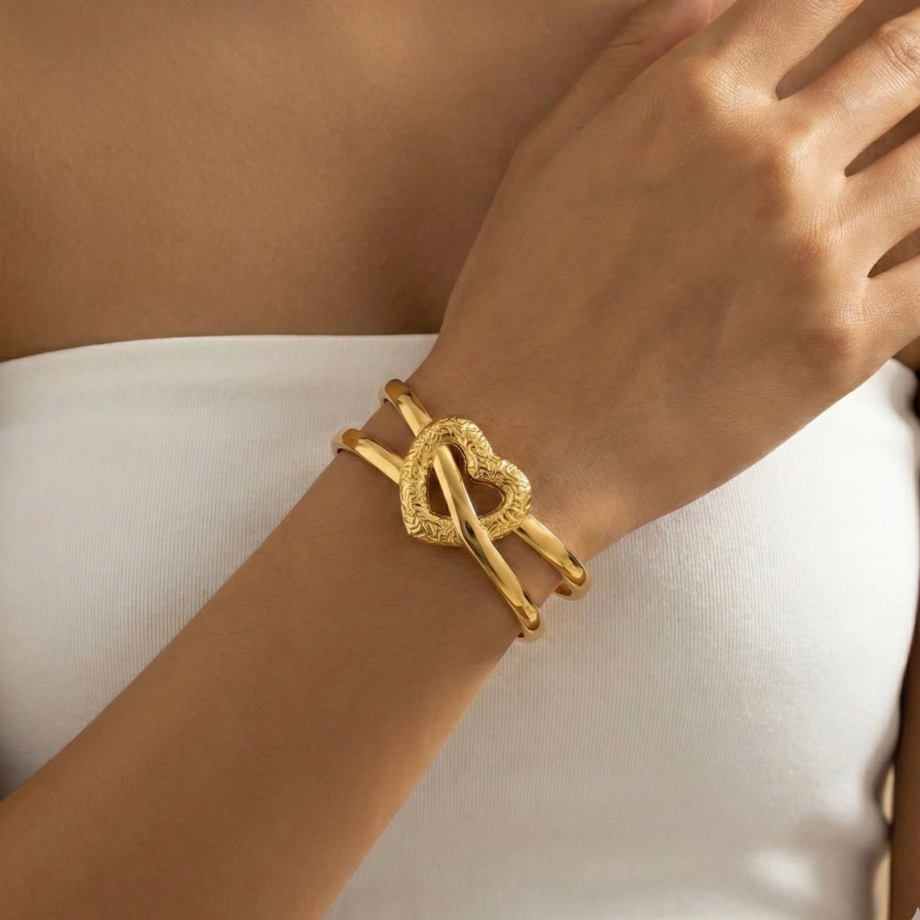 The Molten Gold Love Bracelet features a soft, melted-gold heart design that wraps your wrist in warm elegance. Crafted with a polished gold-tone finish, it’s lightweight, skin-friendly and anti-tarnish — perfect for daily wear. Its fluid, molten look gives a modern twist to the classic heart motif, making it a chic yet romantic accessory for any outfit.