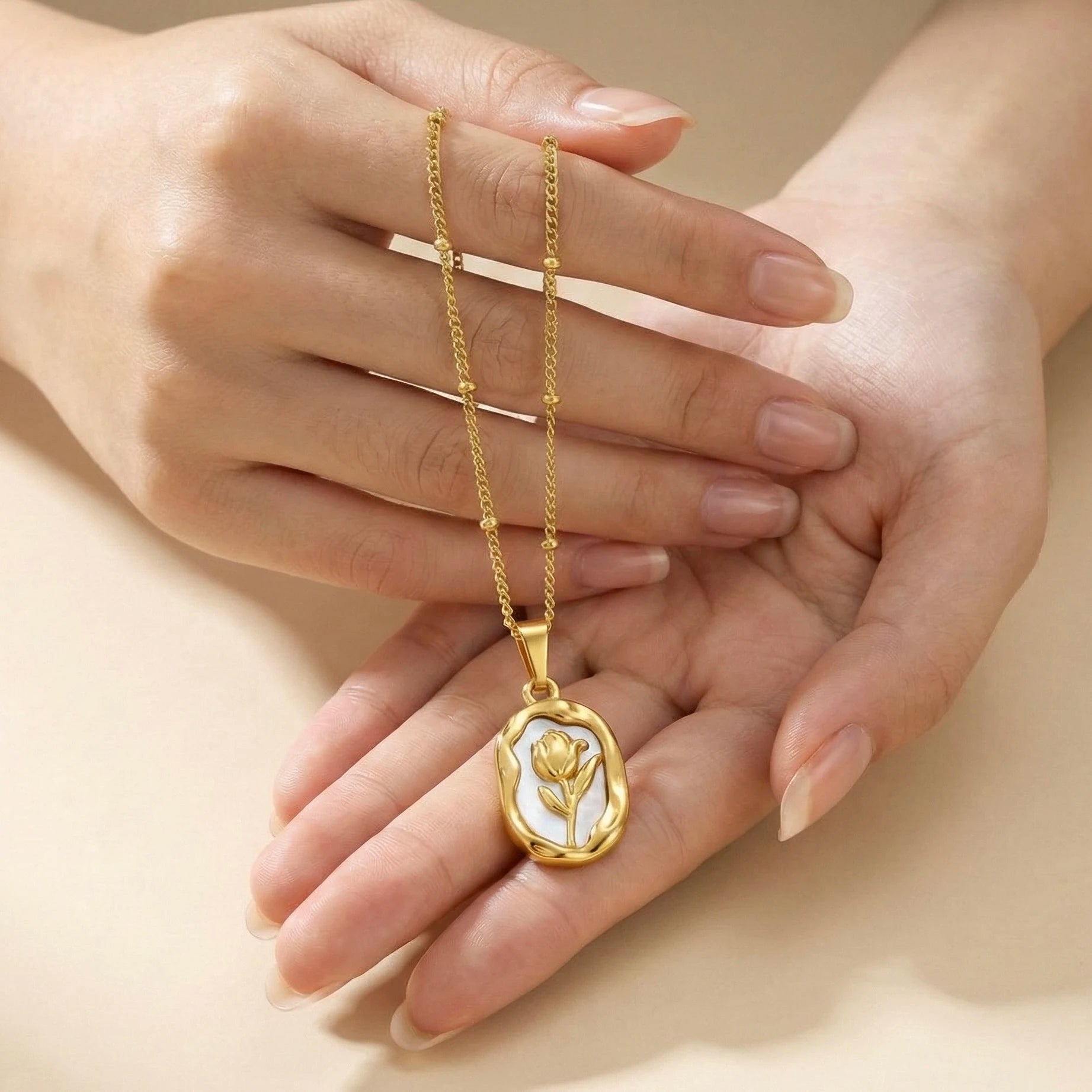 The Timeless Petal Glow Pendant features a delicate cut-out floral design set in a smooth gold-tone frame, crafted from skin-friendly, lightweight and anti-tarnish stainless steel. Perfect for everyday wear or dressed-up occasions, this pendant adds a soft, feminine glow and artistic elegance to your neckline without being overpowering.